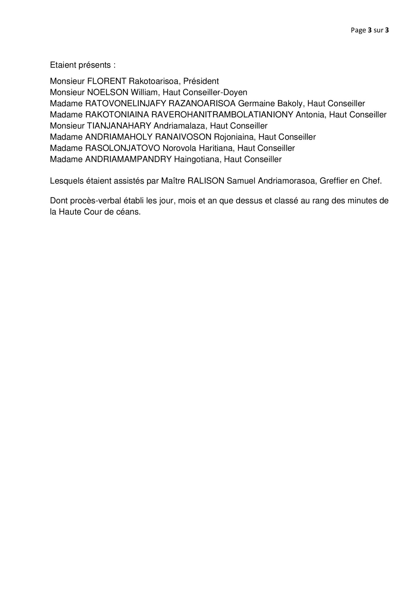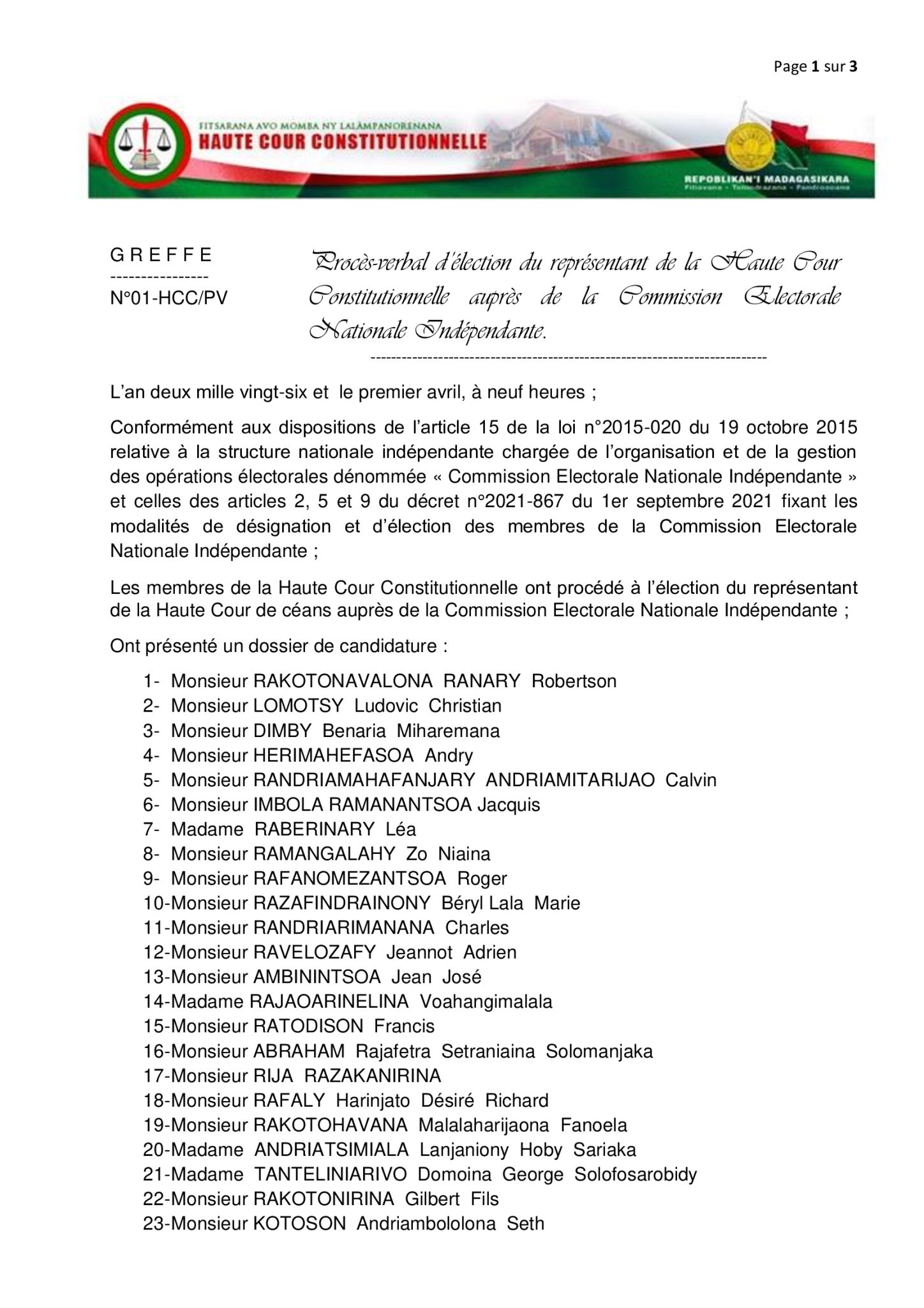 Arrêt n°05-HCC/AR du 1er avril 2026 concernant la saisine du Président de l’Assemblée Nationale aux fins de constatation de la démission d’office du Député RAMANATANANA Roméo Christophe